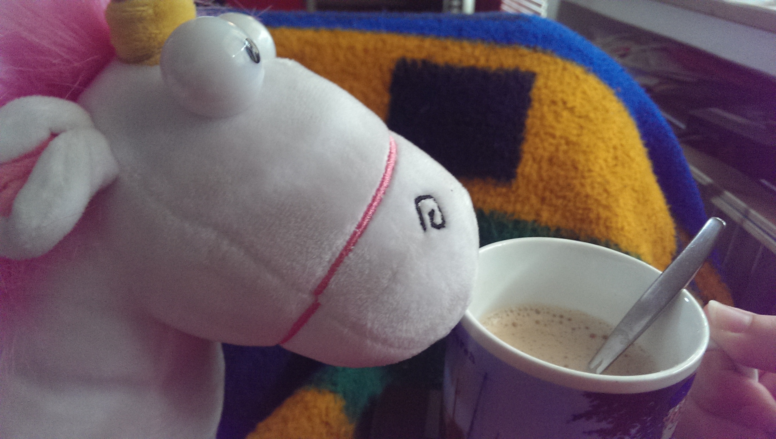 ach so: Ob mein Einhorn Regenbögen und Glitzer pupst kann ich noch nicht sagen… es hat noch nicht gepupst… aber es hat meinen Kaffee gemoppst!